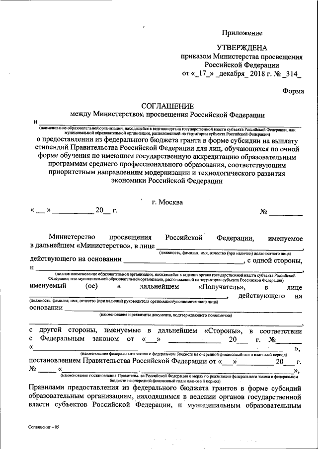 "ОБ УТВЕРЖДЕНИИ ФОРМЫ СОГЛАШЕНИЯ МЕЖДУ МИНИСТЕРСТВОМ ПРОСВЕЩЕНИЯ РОССИЙСКОЙ ФЕДЕРАЦИИ И ОБРАЗОВАТЕЛЬНОЙ ОРГАНИЗАЦИЕЙ, НАХОДЯЩЕЙСЯ В ВЕДЕНИИ ОРГАНА ГОСУДАРСТВЕННОЙ ВЛАСТИ СУБЪЕКТА РОССИЙСКОЙ ФЕДЕРАЦИИ, ИЛИ МУНИЦИПАЛЬНОЙ ОБРАЗОВАТЕЛЬНОЙ ОРГАНИЗАЦИЕЙ, РАСПОЛОЖЕННОЙ НА ТЕРРИТОРИИ СУБЪЕКТА РОССИЙСКОЙ ФЕДЕРАЦИИ, О ПРЕДОСТАВЛЕНИИ ИЗ ФЕДЕРАЛЬНОГО БЮДЖЕТА ГРАНТА В ФОРМЕ СУБСИДИИ НА ВЫПЛАТУ СТИПЕНДИЙ ПРАВИТЕЛЬСТВА РОССИЙСКОЙ ФЕДЕРАЦИИ ДЛЯ ЛИЦ, ОБУЧАЮЩИХСЯ ПО ОЧНОЙ ФОРМЕ ОБУЧЕНИЯ, ПО ИМЕЮЩИМ ГОСУДАРСТВЕННУЮ АККРЕДИТАЦИЮ ОБРАЗОВАТЕЛЬНЫМ ПРОГРАММАМ СРЕДНЕГО ПРОФЕССИОНАЛЬНОГО ОБРАЗОВАНИЯ, СООТВЕТСТВУЮЩИМ ПРИОРИТЕТНЫМ НАПРАВЛЕНИЯМ МОДЕРНИЗАЦИИ И ТЕХНОЛОГИЧЕСКОГО РАЗВИТИЯ ЭКОНОМИКИ РОССИЙСКОЙ ФЕДЕРАЦИИ"