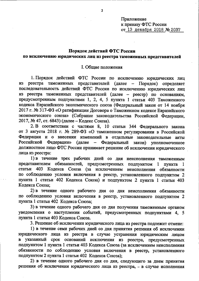 ПРИКАЗ ФТС РФ от 13.12.2018 N 2037