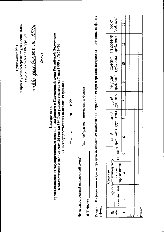 "ОБ УТВЕРЖДЕНИИ ФОРМЫ ИНФОРМАЦИИ, ПРЕДСТАВЛЯЕМОЙ НЕГОСУДАРСТВЕННЫМ ПЕНСИОННЫМ ФОНДОМ В ПЕНСИОННЫЙ ФОНД РОССИЙСКОЙ ФЕДЕРАЦИИ В СООТВЕТСТВИИ С ПОДПУНКТОМ 26 СТАТЬИ 36.2 ФЕДЕРАЛЬНОГО ЗАКОНА ОТ 7 МАЯ 1998 Г. N 75-ФЗ "О НЕГОСУДАРСТВЕННЫХ ПЕНСИОННЫХ ФОНДАХ", ФОРМАТОВ, ПОРЯДКА И СРОКОВ ПРЕДСТАВЛЕНИЯ УКАЗАННОЙ ИНФОРМАЦИИ И ПРИЗНАНИИ УТРАТИВШИМ СИЛУ ПРИКАЗА МИНИСТЕРСТВА ТРУДА И СОЦИАЛЬНОЙ ЗАЩИТЫ РОССИЙСКОЙ ФЕДЕРАЦИИ ОТ 14 ОКТЯБРЯ 2014 Г. N 722Н И ВНЕСЕННЫХ В НЕГО ИЗМЕНЕНИЙ"