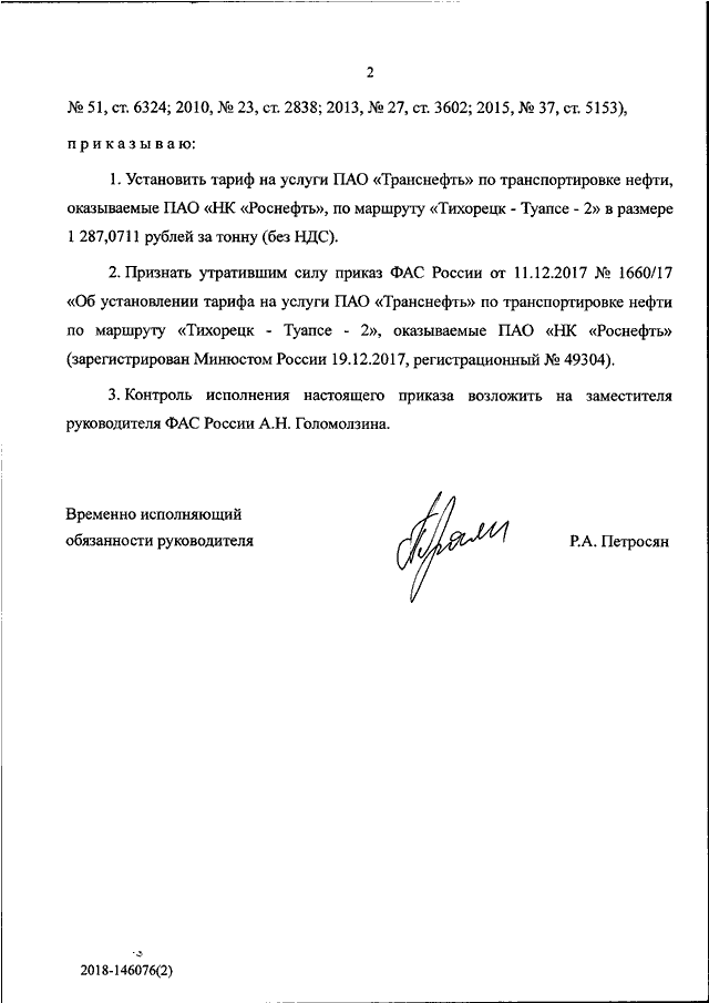 "ОБ УСТАНОВЛЕНИИ ТАРИФА НА УСЛУГИ ПАО "ТРАНСНЕФТЬ" ПО ТРАНСПОРТИРОВКЕ НЕФТИ ПО МАРШРУТУ "ТИХОРЕЦК - ТУАПСЕ - 2", ОКАЗЫВАЕМЫЕ ПАО "НК "РОСНЕФТЬ"