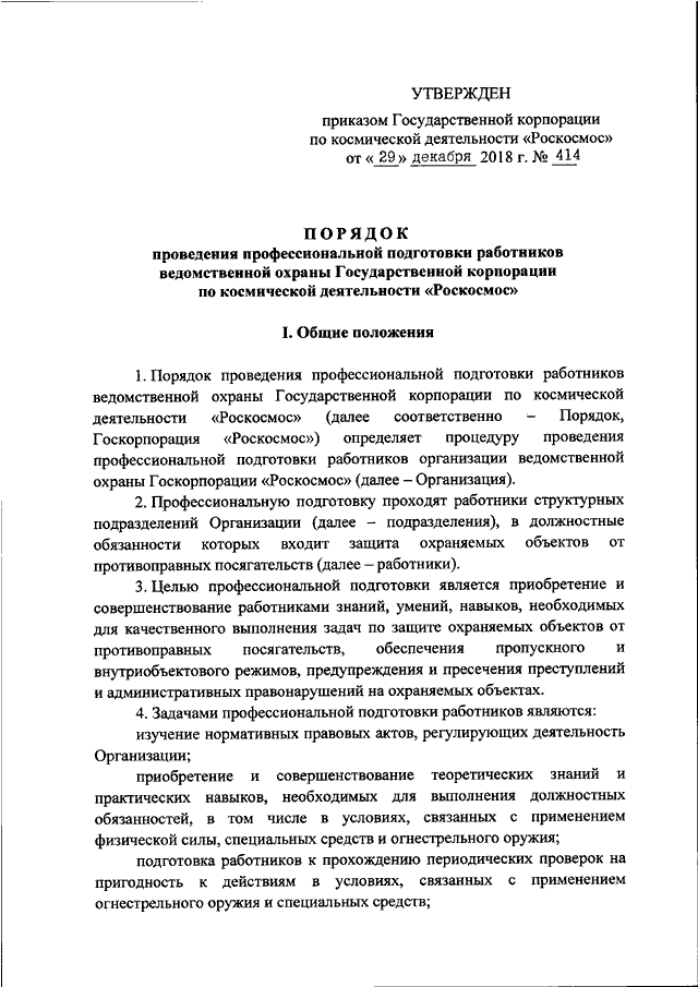 "Росатом" от 29.12.2018 N 414 "ОБ УТВЕРЖДЕНИИ ПОРЯДКА ПРОВЕДЕНИЯ ПРОФЕССИОНАЛЬНОЙ ПОДГОТОВКИ РАБОТНИКОВ ВЕДОМСТВЕННОЙ ОХРАНЫ ГОСУДАРСТВЕННОЙ КОРПОРАЦИИ ПО КОСМИЧЕСКОЙ ДЕЯТЕЛЬНОСТИ "РОСКОСМОС"