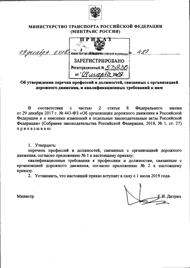 ПРИКАЗ Минтранса РФ от 29.12.2018 N 487