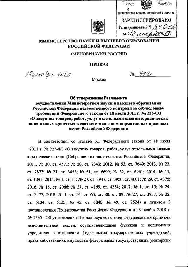"ОБ УТВЕРЖДЕНИИ РЕГЛАМЕНТА ОСУЩЕСТВЛЕНИЯ МИНИСТЕРСТВОМ НАУКИ И ВЫСШЕГО ОБРАЗОВАНИЯ РОССИЙСКОЙ ФЕДЕРАЦИИ ВЕДОМСТВЕННОГО КОНТРОЛЯ ЗА СОБЛЮДЕНИЕМ ТРЕБОВАНИЙ ФЕДЕРАЛЬНОГО ЗАКОНА ОТ 18 ИЮЛЯ 2011 Г. N 223-ФЗ "О ЗАКУПКАХ ТОВАРОВ, РАБОТ, УСЛУГ ОТДЕЛЬНЫМИ ВИДАМИ ЮРИДИЧЕСКИХ ЛИЦ" И ИНЫХ ПРИНЯТЫХ В СООТВЕТСТВИИ С НИМ НОРМАТИВНЫХ ПРАВОВЫХ АКТОВ РОССИЙСКОЙ ФЕДЕРАЦИИ"