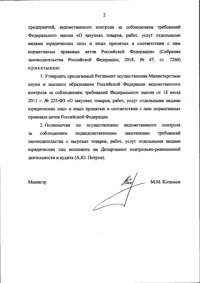 "ОБ УТВЕРЖДЕНИИ РЕГЛАМЕНТА ОСУЩЕСТВЛЕНИЯ МИНИСТЕРСТВОМ НАУКИ И ВЫСШЕГО ОБРАЗОВАНИЯ РОССИЙСКОЙ ФЕДЕРАЦИИ ВЕДОМСТВЕННОГО КОНТРОЛЯ ЗА СОБЛЮДЕНИЕМ ТРЕБОВАНИЙ ФЕДЕРАЛЬНОГО ЗАКОНА ОТ 18 ИЮЛЯ 2011 Г. N 223-ФЗ "О ЗАКУПКАХ ТОВАРОВ, РАБОТ, УСЛУГ ОТДЕЛЬНЫМИ ВИДАМИ ЮРИДИЧЕСКИХ ЛИЦ" И ИНЫХ ПРИНЯТЫХ В СООТВЕТСТВИИ С НИМ НОРМАТИВНЫХ ПРАВОВЫХ АКТОВ РОССИЙСКОЙ ФЕДЕРАЦИИ"