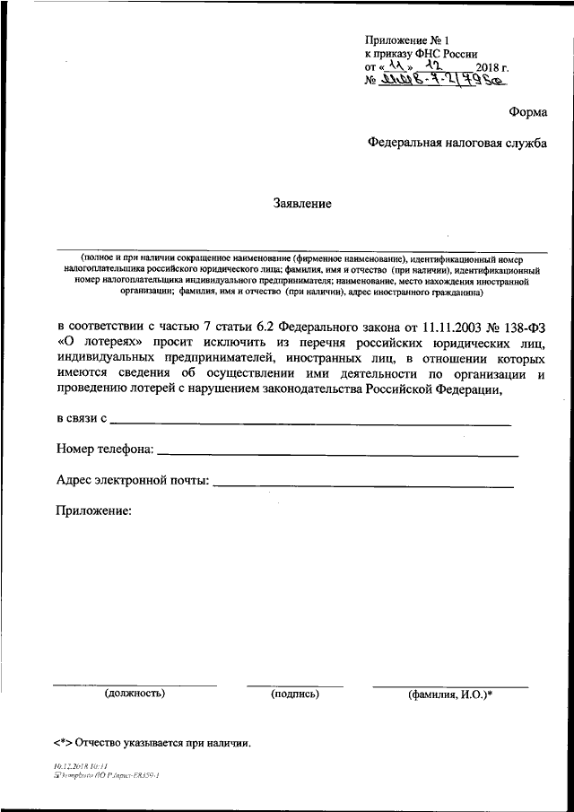 "ОБ УТВЕРЖДЕНИИ ФОРМЫ И ПОРЯДКА НАПРАВЛЕНИЯ ЗАЯВЛЕНИЯ ОБ ИСКЛЮЧЕНИИ ИЗ ПЕРЕЧНЯ РОССИЙСКИХ ЮРИДИЧЕСКИХ ЛИЦ, ИНДИВИДУАЛЬНЫХ ПРЕДПРИНИМАТЕЛЕЙ, ИНОСТРАННЫХ ЛИЦ, В ОТНОШЕНИИ КОТОРЫХ ИМЕЮТСЯ СВЕДЕНИЯ ОБ ОСУЩЕСТВЛЕНИИ ИМИ ДЕЯТЕЛЬНОСТИ ПО ОРГАНИЗАЦИИ И ПРОВЕДЕНИЮ ЛОТЕРЕЙ С НАРУШЕНИЕМ ЗАКОНОДАТЕЛЬСТВА РОССИЙСКОЙ ФЕДЕРАЦИИ; ФОРМЫ И ПОРЯДКА НАПРАВЛЕНИЯ ЗАЯВЛЕНИЯ ОБ ИСКЛЮЧЕНИИ ИЗ ПЕРЕЧНЯ РОССИЙСКИХ ЮРИДИЧЕСКИХ ЛИЦ, ИНДИВИДУАЛЬНЫХ ПРЕДПРИНИМАТЕЛЕЙ, ИНОСТРАННЫХ ЛИЦ, В ОТНОШЕНИИ КОТОРЫХ ИМЕЮТСЯ СВЕДЕНИЯ ОБ ОСУЩЕСТВЛЕНИИ ИМИ ДЕЯТЕЛЬНОСТИ ПО ОРГАНИЗАЦИИ И ПРОВЕДЕНИЮ АЗАРТНЫХ ИГР С НАРУШЕНИЕМ ЗАКОНОДАТЕЛЬСТВА РОССИЙСКОЙ ФЕДЕРАЦИИ"