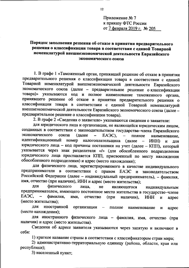 ПРИКАЗ ФТС РФ от 07.02.2019 N 205
