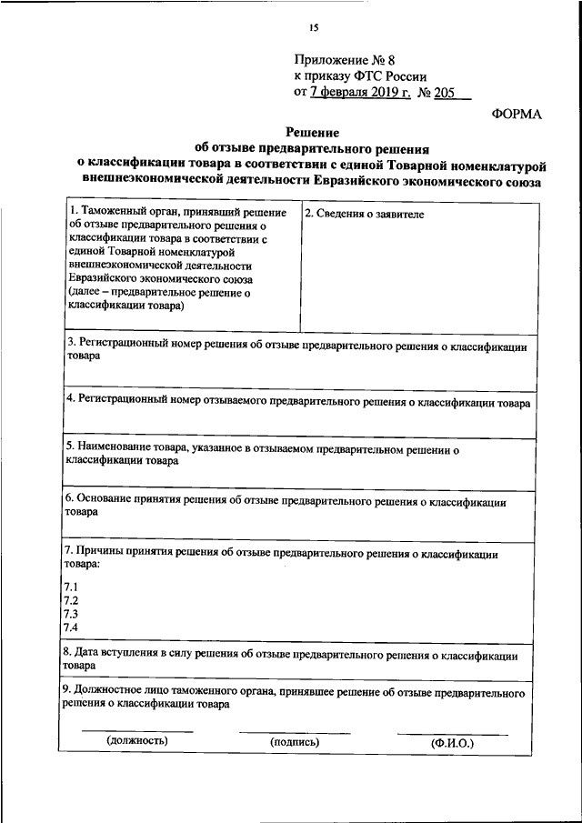 ПРИКАЗ ФТС РФ от 07.02.2019 N 205