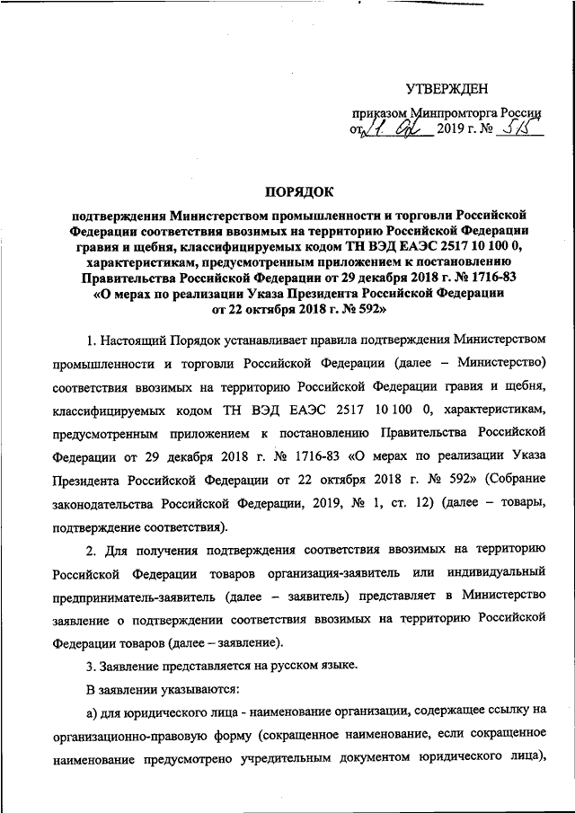 "ОБ УТВЕРЖДЕНИИ ПОРЯДКА ПОДТВЕРЖДЕНИЯ МИНИСТЕРСТВОМ ПРОМЫШЛЕННОСТИ И ТОРГОВЛИ РОССИЙСКОЙ ФЕДЕРАЦИИ СООТВЕТСТВИЯ ВВОЗИМЫХ НА ТЕРРИТОРИЮ РОССИЙСКОЙ ФЕДЕРАЦИИ ГРАВИЯ И ЩЕБНЯ, КЛАССИФИЦИРУЕМЫХ КОДОМ ТН ВЭД ЕАЭС 2517 10 100 О, ХАРАКТЕРИСТИКАМ, ПРЕДУСМОТРЕННЫМ ПРИЛОЖЕНИЕМ К ПОСТАНОВЛЕНИЮ ПРАВИТЕЛЬСТВА РОССИЙСКОЙ ФЕДЕРАЦИИ ОТ 29 ДЕКАБРЯ 2018 Г. N 1716-83 "О МЕРАХ ПО РЕАЛИЗАЦИИ УКАЗА ПРЕЗИДЕНТА РОССИЙСКОЙ ФЕДЕРАЦИИ ОТ 22 ОКТЯБРЯ 2018 Г. N 592"