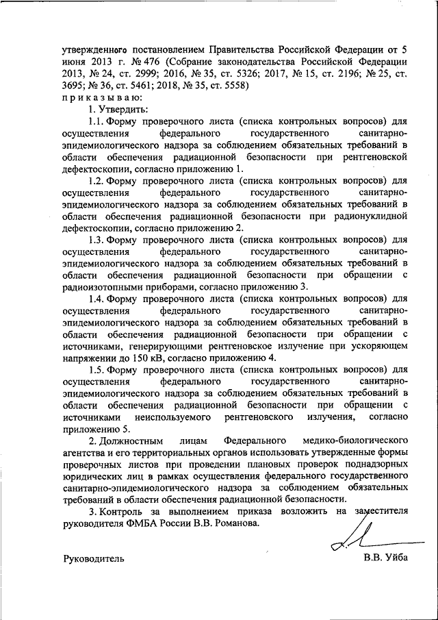 "ОБ УТВЕРЖДЕНИИ ФОРМ ПРОВЕРОЧНЫХ ЛИСТОВ (СПИСКОВ КОНТРОЛЬНЫХ ВОПРОСОВ), ИСПОЛЬЗУЕМЫХ ДОЛЖНОСТНЫМИ ЛИЦАМИ ФЕДЕРАЛЬНОГО МЕДИКО - БИОЛОГИЧЕСКОГО АГЕНТСТВА И ЕГО ТЕРРИТОРИАЛЬНЫХ ОРГАНОВ ПРИ ПРОВЕДЕНИИ ПРОВЕРОК СОБЛЮДЕНИЯ ТРЕБОВАНИЙ РАДИАЦИОННОЙ БЕЗОПАСНОСТИ ПРИ ОБРАЩЕНИИ С РАДИАЦИОННЫМИ ИСТОЧНИКАМИ"