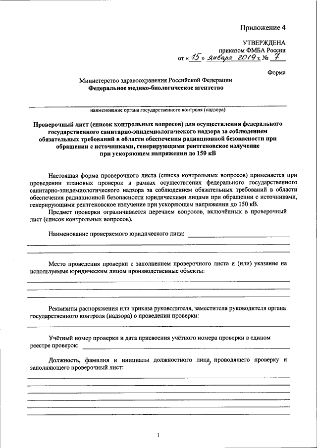 "ОБ УТВЕРЖДЕНИИ ФОРМ ПРОВЕРОЧНЫХ ЛИСТОВ (СПИСКОВ КОНТРОЛЬНЫХ ВОПРОСОВ), ИСПОЛЬЗУЕМЫХ ДОЛЖНОСТНЫМИ ЛИЦАМИ ФЕДЕРАЛЬНОГО МЕДИКО - БИОЛОГИЧЕСКОГО АГЕНТСТВА И ЕГО ТЕРРИТОРИАЛЬНЫХ ОРГАНОВ ПРИ ПРОВЕДЕНИИ ПРОВЕРОК СОБЛЮДЕНИЯ ТРЕБОВАНИЙ РАДИАЦИОННОЙ БЕЗОПАСНОСТИ ПРИ ОБРАЩЕНИИ С РАДИАЦИОННЫМИ ИСТОЧНИКАМИ"