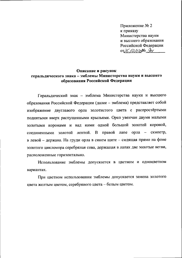 "ОБ УЧРЕЖДЕНИИ ГЕРАЛЬДИЧЕСКОГО ЗНАКА - ЭМБЛЕМЫ МИНИСТЕРСТВА НАУКИ И ВЫСШЕГО ОБРАЗОВАНИЯ РОССИЙСКОЙ ФЕДЕРАЦИИ"
