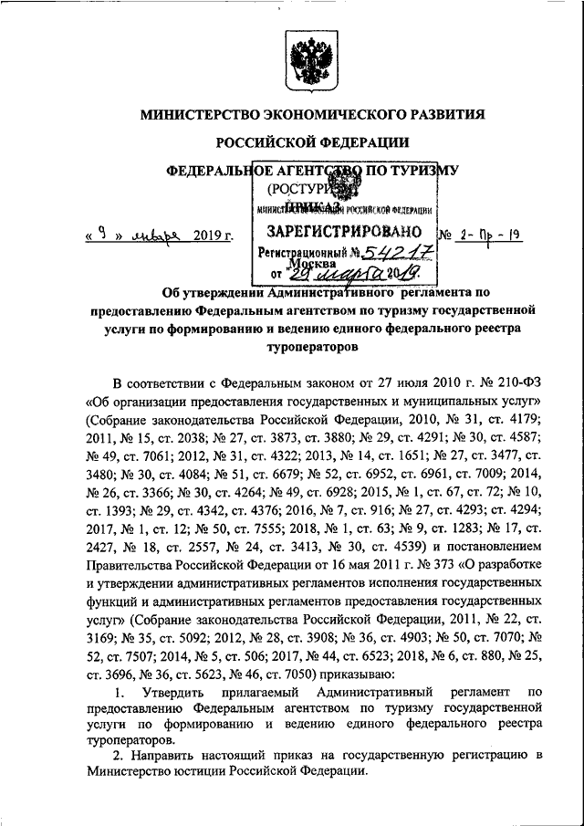 ПРИКАЗ Ростуризма от 09.01.2019 N 2-Пр-19