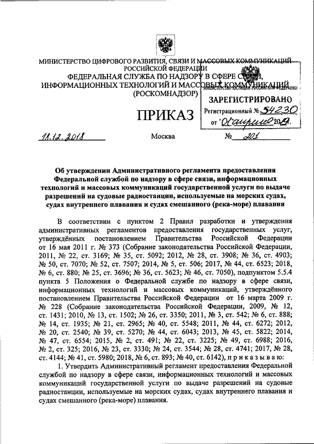 "ОБ УТВЕРЖДЕНИИ АДМИНИСТРАТИВНОГО РЕГЛАМЕНТА ПРЕДОСТАВЛЕНИЯ ФЕДЕРАЛЬНОЙ СЛУЖБОЙ ПО НАДЗОРУ В СФЕРЕ СВЯЗИ, ИНФОРМАЦИОННЫХ ТЕХНОЛОГИЙ И МАССОВЫХ КОММУНИКАЦИЙ ГОСУДАРСТВЕННОЙ УСЛУГИ ПО ВЫДАЧЕ РАЗРЕШЕНИЙ НА СУДОВЫЕ РАДИОСТАНЦИИ, ИСПОЛЬЗУЕМЫЕ НА МОРСКИХ СУДАХ, СУДАХ ВНУТРЕННЕГО ПЛАВАНИЯ И СУДАХ СМЕШАННОГО (РЕКА - МОРЕ) ПЛАВАНИЯ"
