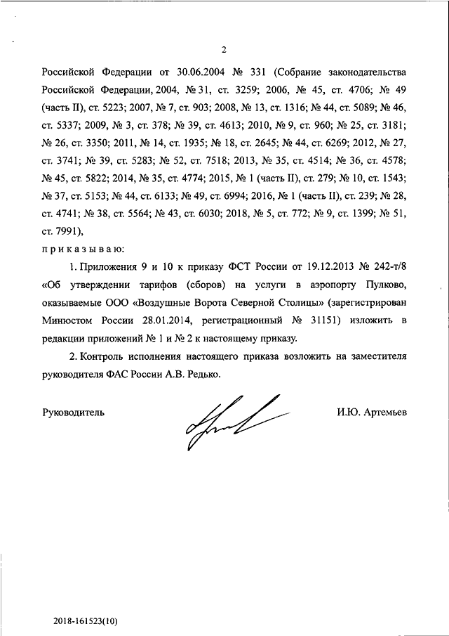 "О ВНЕСЕНИИ ИЗМЕНЕНИЙ В ПРИКАЗ ФСТ РОССИИ ОТ 19.12.2013 N 242-Т/8 "ОБ УТВЕРЖДЕНИИ ТАРИФОВ (СБОРОВ) НА УСЛУГИ В АЭРОПОРТУ ПУЛКОВО, ОКАЗЫВАЕМЫЕ ООО "ВОЗДУШНЫЕ ВОРОТА СЕВЕРНОЙ СТОЛИЦЫ"