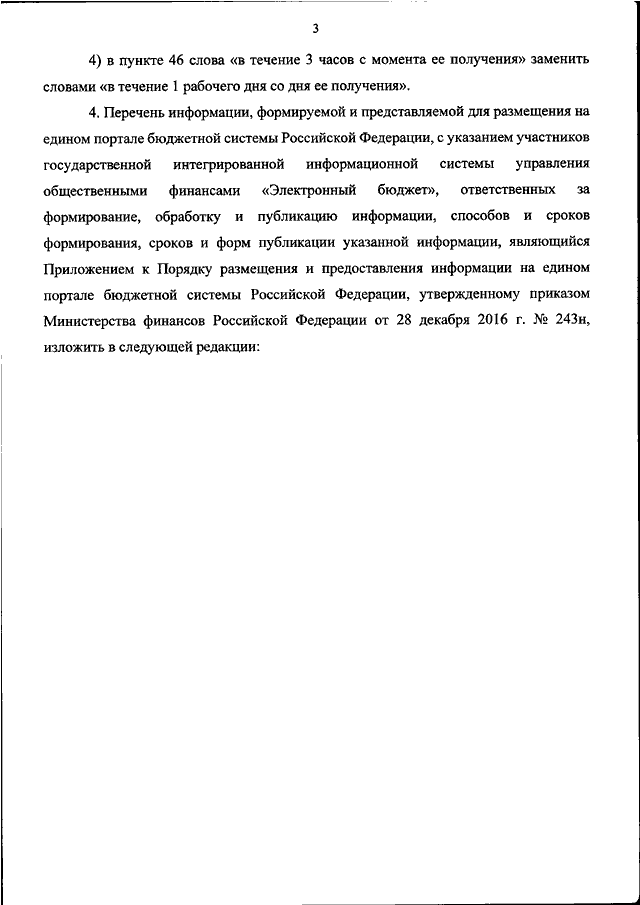 "О ВНЕСЕНИИ ИЗМЕНЕНИЙ В ПРИКАЗ МИНИСТЕРСТВА ФИНАНСОВ РОССИЙСКОЙ ФЕДЕРАЦИИ ОТ 28 ДЕКАБРЯ 2016 Г. N 243Н "О СОСТАВЕ И ПОРЯДКЕ РАЗМЕЩЕНИЯ И ПРЕДОСТАВЛЕНИЯ ИНФОРМАЦИИ НА ЕДИНОМ ПОРТАЛЕ БЮДЖЕТНОЙ СИСТЕМЫ РОССИЙСКОЙ ФЕДЕРАЦИИ"