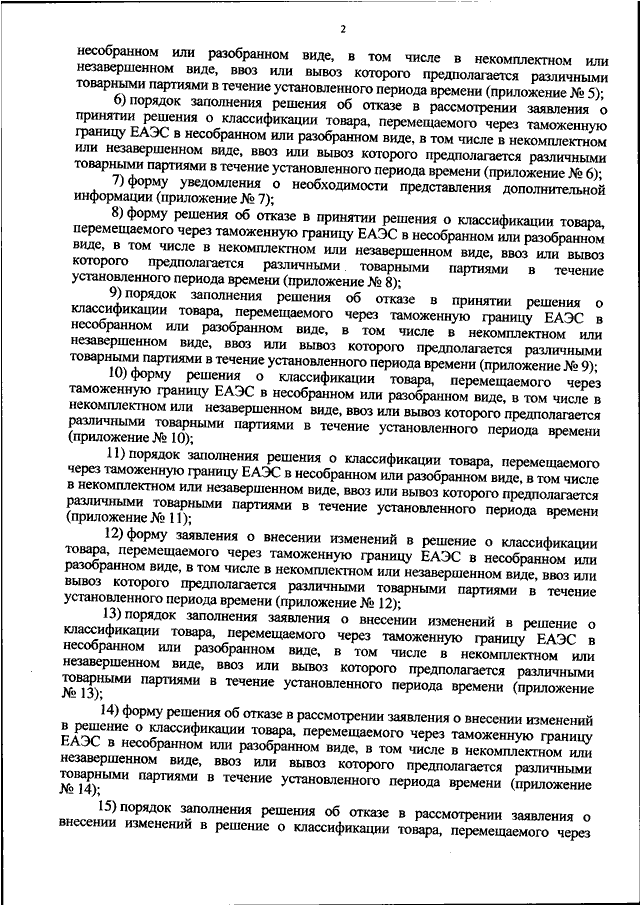 "ОБ УТВЕРЖДЕНИИ ФОРМ И ПОРЯДКОВ ЗАПОЛНЕНИЯ ДОКУМЕНТОВ, ИСПОЛЬЗУЕМЫХ ПРИ ПРИНЯТИИ РЕШЕНИЯ О КЛАССИФИКАЦИИ ТОВАРА, ПЕРЕМЕЩАЕМОГО ЧЕРЕЗ ТАМОЖЕННУЮ ГРАНИЦУ ЕВРАЗИЙСКОГО ЭКОНОМИЧЕСКОГО СОЮЗА В НЕСОБРАННОМ ИЛИ РАЗОБРАННОМ ВИДЕ, В ТОМ ЧИСЛЕ В НЕКОМПЛЕКТНОМ ИЛИ НЕЗАВЕРШЕННОМ ВИДЕ, ВВОЗ ИЛИ ВЫВОЗ КОТОРОГО ПРЕДПОЛАГАЕТСЯ РАЗЛИЧНЫМИ ТОВАРНЫМИ ПАРТИЯМИ В ТЕЧЕНИЕ УСТАНОВЛЕННОГО ПЕРИОДА ВРЕМЕНИ, ПРИ ВНЕСЕНИИ ИЗМЕНЕНИЙ В ТАКОЕ РЕШЕНИЕ, ПРИ ОТКАЗЕ В РАССМОТРЕНИИ ЗАЯВЛЕНИЯ И ПРИНЯТИИ ТАКОГО РЕШЕНИЯ, А ТАКЖЕ ПРИ ПРЕКРАЩЕНИИ ДЕЙСТВИЯ ТАКОГО РЕШЕНИЯ"