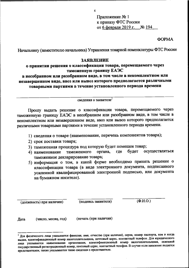 ПРИКАЗ ФТС РФ от 06.02.2019 N 194