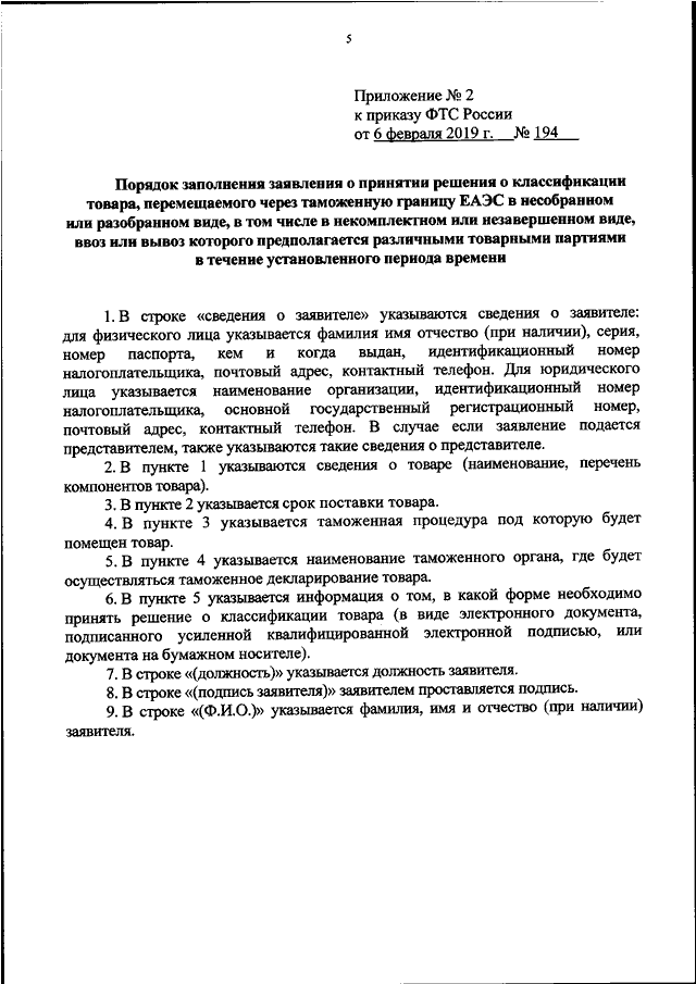 ПРИКАЗ ФТС РФ от 06.02.2019 N 194