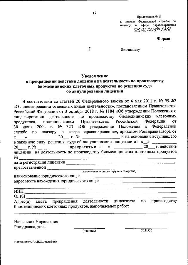 ПРИКАЗ Росздравнадзора от 25.02.2019 N 1318