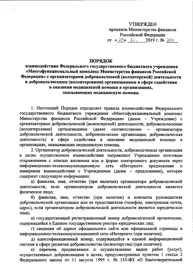"ОБ УТВЕРЖДЕНИИ ПОРЯДКА ВЗАИМОДЕЙСТВИЯ ФЕДЕРАЛЬНОГО ГОСУДАРСТВЕННОГО БЮДЖЕТНОГО УЧРЕЖДЕНИЯ "МНОГОФУНКЦИОНАЛЬНЫЙ КОМПЛЕКС МИНИСТЕРСТВА ФИНАНСОВ РОССИЙСКОЙ ФЕДЕРАЦИИ" С ОРГАНИЗАТОРАМИ ДОБРОВОЛЬЧЕСКОЙ (ВОЛОНТЕРСКОЙ) ДЕЯТЕЛЬНОСТИ И ДОБРОВОЛЬЧЕСКИМИ (ВОЛОНТЕРСКИМИ) ОРГАНИЗАЦИЯМИ В СФЕРЕ СОДЕЙСТВИЯ В ОКАЗАНИИ МЕДИЦИНСКОЙ ПОМОЩИ В ОРГАНИЗАЦИЯХ, ОКАЗЫВАЮЩИХ МЕДИЦИНСКУЮ ПОМОЩЬ"