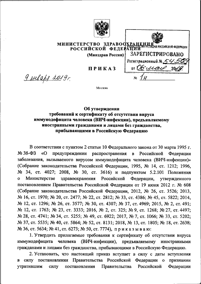 ПРИКАЗ Минздрава РФ от 09.01.2019 N 1н