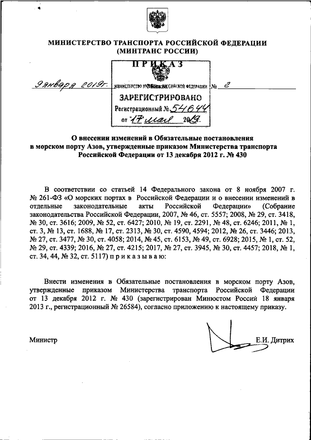 ПРИКАЗ Минтранса РФ от 09.01.2019 N 2