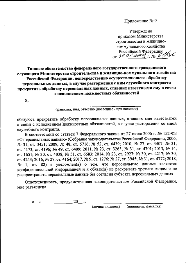 (вместе с "ПРАВИЛАМИ ОСУЩЕСТВЛЕНИЯ ВНУТРЕННЕГО КОНТРОЛЯ СООТВЕТСТВИЯ ОБРАБОТКИ ПЕРСОНАЛЬНЫХ ДАННЫХ ТРЕБОВАНИЯМ К ЗАЩИТЕ ПЕРСОНАЛЬНЫХ ДАННЫХ, УСТАНОВЛЕННЫМ ФЕДЕРАЛЬНЫМ ЗАКОНОМ ОТ 27 ИЮЛЯ 2006 Г. N 152-ФЗ "О ПЕРСОНАЛЬНЫХ ДАННЫХ", "ПРАВИЛАМИ РАССМОТРЕНИЯ ЗАПРОСОВ СУБЪЕКТОВ ПЕРСОНАЛЬНЫХ ДАННЫХ ИЛИ ИХ ПРЕДСТАВИТЕЛЕЙ", "ПРАВИЛАМИ РАБОТЫ С ОБЕЗЛИЧЕННЫМИ ДАННЫМИ В СЛУЧАЕ ОБЕЗЛИЧИВАНИЯ ПЕРСОНАЛЬНЫХ ДАННЫХ В МИНИСТЕРСТВЕ СТРОИТЕЛЬСТВА И ЖИЛИЩНО - КОММУНАЛЬНОГО ХОЗЯЙСТВА РОССИЙСКОЙ ФЕДЕРАЦИИ") (Зарегистрировано в Минюсте РФ 17.05.2019 N 54651)