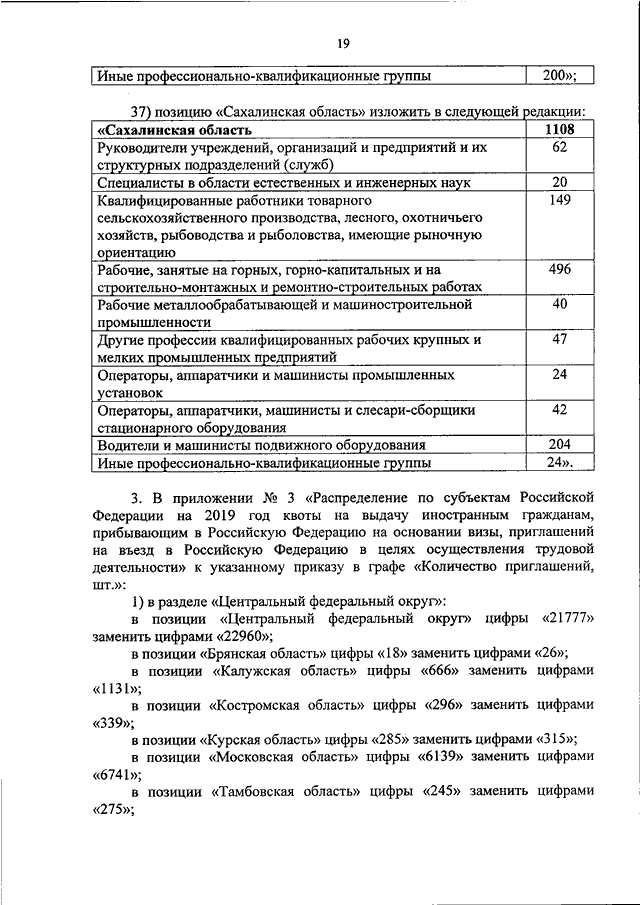 "О ВНЕСЕНИИ ИЗМЕНЕНИЙ В ПРИЛОЖЕНИЯ N 1 - 3 К ПРИКАЗУ МИНИСТЕРСТВА ТРУДА И СОЦИАЛЬНОЙ ЗАЩИТЫ РОССИЙСКОЙ ФЕДЕРАЦИИ ОТ 24 ДЕКАБРЯ 2018 Г. N 832Н "О РАСПРЕДЕЛЕНИИ ПО СУБЪЕКТАМ РОССИЙСКОЙ ФЕДЕРАЦИИ УТВЕРЖДЕННЫХ ПРАВИТЕЛЬСТВОМ РОССИЙСКОЙ ФЕДЕРАЦИИ НА 2019 ГОД КВОТ НА ВЫДАЧУ ИНОСТРАННЫМ ГРАЖДАНАМ, ПРИБЫВАЮЩИМ В РОССИЙСКУЮ ФЕДЕРАЦИЮ НА ОСНОВАНИИ ВИЗЫ, РАЗРЕШЕНИЙ НА РАБОТУ И ПРИГЛАШЕНИЙ НА ВЪЕЗД В РОССИЙСКУЮ ФЕДЕРАЦИЮ В ЦЕЛЯХ ОСУЩЕСТВЛЕНИЯ ТРУДОВОЙ ДЕЯТЕЛЬНОСТИ"