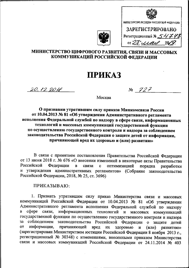 ПРИКАЗ Минкомсвязи РФ от 20.12.2018 N 727
