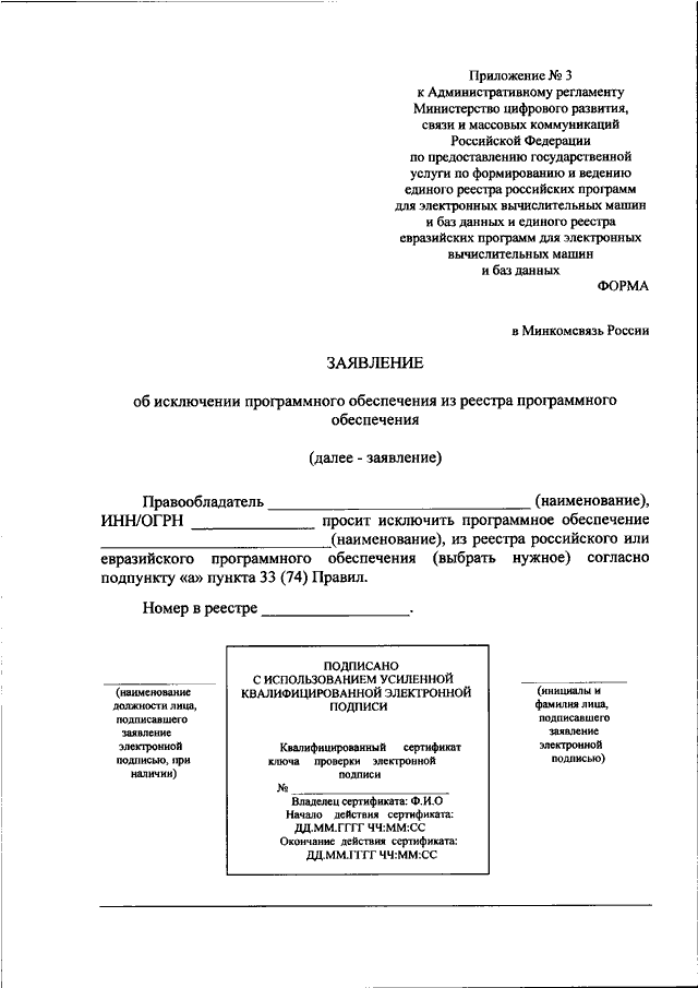 "ОБ УТВЕРЖДЕНИИ АДМИНИСТРАТИВНОГО РЕГЛАМЕНТА ПРЕДОСТАВЛЕНИЯ МИНИСТЕРСТВОМ ЦИФРОВОГО РАЗВИТИЯ, СВЯЗИ И МАССОВЫХ КОММУНИКАЦИЙ РОССИЙСКОЙ ФЕДЕРАЦИИ ГОСУДАРСТВЕННОЙ УСЛУГИ ПО ФОРМИРОВАНИЮ И ВЕДЕНИЮ ЕДИНОГО РЕЕСТРА РОССИЙСКИХ ПРОГРАММ ДЛЯ ЭЛЕКТРОННЫХ ВЫЧИСЛИТЕЛЬНЫХ МАШИН И БАЗ ДАННЫХ И ЕДИНОГО РЕЕСТРА ЕВРАЗИЙСКИХ ПРОГРАММ ДЛЯ ЭЛЕКТРОННЫХ ВЫЧИСЛИТЕЛЬНЫХ МАШИН И БАЗ ДАННЫХ"