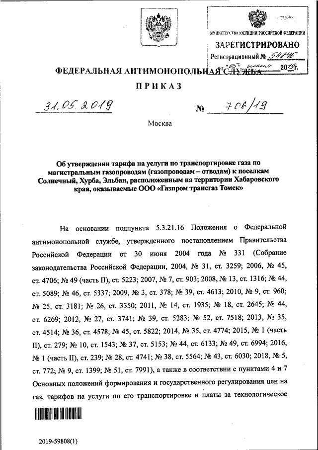 ПРИКАЗ Федеральной антимонопольной службы от 31.05.2019 N 706/19