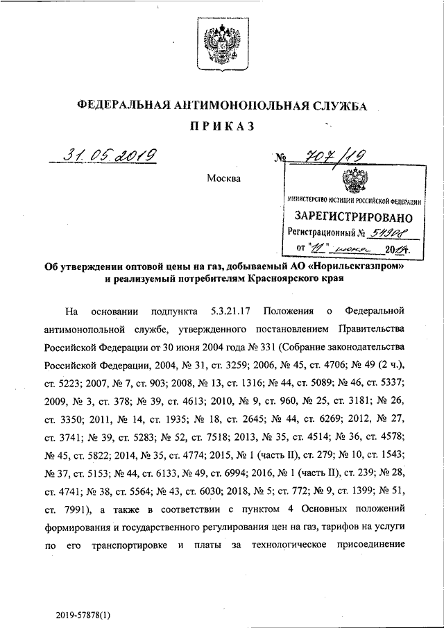 ПРИКАЗ Федеральной антимонопольной службы от 31.05.2019 N 707/19