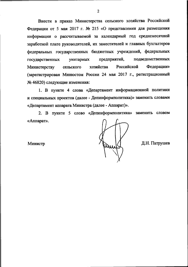 "О ВНЕСЕНИИ ИЗМЕНЕНИЙ В ПРИКАЗ МИНИСТЕРСТВА СЕЛЬСКОГО ХОЗЯЙСТВА РОССИЙСКОЙ ФЕДЕРАЦИИ ОТ 5 МАЯ 2017 Г. N 215 "О ПРЕДСТАВЛЕНИИ ДЛЯ РАЗМЕЩЕНИЯ ИНФОРМАЦИИ О РАССЧИТЫВАЕМОЙ ЗА КАЛЕНДАРНЫЙ ГОД СРЕДНЕМЕСЯЧНОЙ ЗАРАБОТНОЙ ПЛАТЕ РУКОВОДИТЕЛЕЙ, ИХ ЗАМЕСТИТЕЛЕЙ И ГЛАВНЫХ БУХГАЛТЕРОВ ФЕДЕРАЛЬНЫХ ГОСУДАРСТВЕННЫХ БЮДЖЕТНЫХ УЧРЕЖДЕНИЙ, ФЕДЕРАЛЬНЫХ ГОСУДАРСТВЕННЫХ УНИТАРНЫХ ПРЕДПРИЯТИЙ, ПОДВЕДОМСТВЕННЫХ МИНИСТЕРСТВУ СЕЛЬСКОГО ХОЗЯЙСТВА РОССИЙСКОЙ ФЕДЕРАЦИИ"