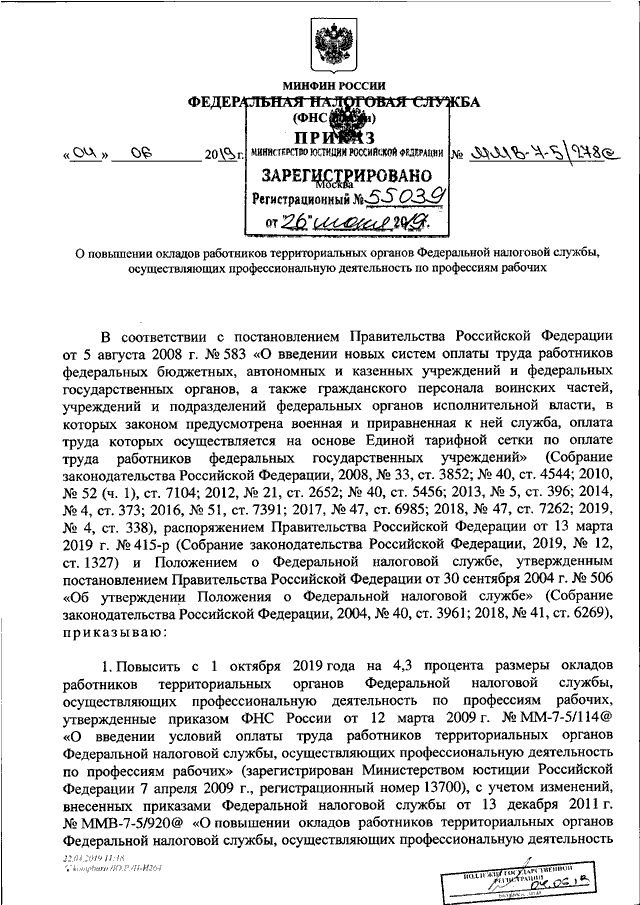 "О ПОВЫШЕНИИ ОКЛАДОВ РАБОТНИКОВ ТЕРРИТОРИАЛЬНЫХ ОРГАНОВ ФЕДЕРАЛЬНОЙ НАЛОГОВОЙ СЛУЖБЫ, ОСУЩЕСТВЛЯЮЩИХ ПРОФЕССИОНАЛЬНУЮ ДЕЯТЕЛЬНОСТЬ ПО ПРОФЕССИЯМ РАБОЧИХ"