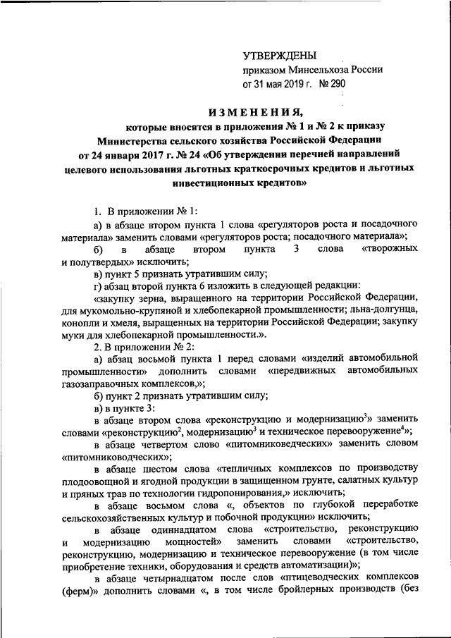 "О ВНЕСЕНИИ ИЗМЕНЕНИЙ В ПРИЛОЖЕНИЯ N 1 И N 2 К ПРИКАЗУ МИНИСТЕРСТВА СЕЛЬСКОГО ХОЗЯЙСТВА РОССИЙСКОЙ ФЕДЕРАЦИИ ОТ 24 ЯНВАРЯ 2017 Г. N 24 "ОБ УТВЕРЖДЕНИИ ПЕРЕЧНЕЙ НАПРАВЛЕНИЙ ЦЕЛЕВОГО ИСПОЛЬЗОВАНИЯ ЛЬГОТНЫХ КРАТКОСРОЧНЫХ КРЕДИТОВ И ЛЬГОТНЫХ ИНВЕСТИЦИОННЫХ КРЕДИТОВ"