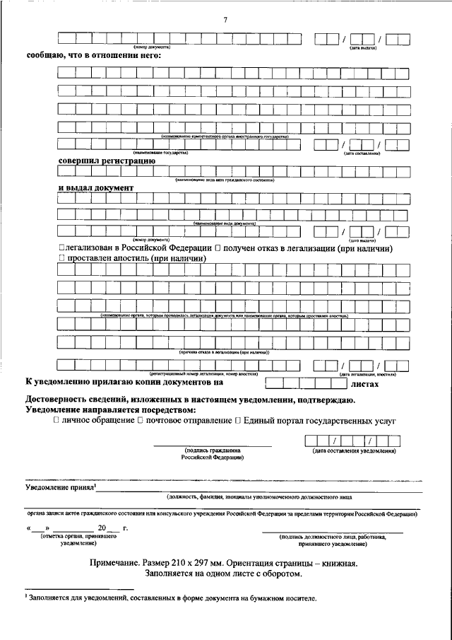"О ФОРМАХ УВЕДОМЛЕНИЙ О РЕГИСТРАЦИИ КОМПЕТЕНТНЫМ ОРГАНОМ ИНОСТРАННОГО ГОСУДАРСТВА ПО ЗАКОНАМ СООТВЕТСТВУЮЩЕГО ИНОСТРАННОГО ГОСУДАРСТВА В ОТНОШЕНИИ ГРАЖДАНИНА РОССИЙСКОЙ ФЕДЕРАЦИИ ИЛИ В ОТНОШЕНИИ ЕГО НЕСОВЕРШЕННОЛЕТНЕГО РЕБЕНКА, СОСТОЯЩЕГО В ГРАЖДАНСТВЕ РОССИЙСКОЙ ФЕДЕРАЦИИ, ЛИБО В ОТНОШЕНИИ НЕ ДОСТИГШЕГО 18 ЛЕТ ИЛИ ОГРАНИЧЕННОГО В ДЕЕСПОСОБНОСТИ ГРАЖДАНИНА РОССИЙСКОЙ ФЕДЕРАЦИИ, ЗАКОННЫМ ПРЕДСТАВИТЕЛЕМ КОТОРОГО ГРАЖДАНИН РОССИЙСКОЙ ФЕДЕРАЦИИ ЯВЛЯЕТСЯ, АКТА ГРАЖДАНСКОГО СОСТОЯНИЯ, СПРАВКИ О ВКЛЮЧЕНИИ СВЕДЕНИЙ О ДОКУМЕНТЕ, ВЫДАННОМ КОМПЕТЕНТНЫМ ОРГАНОМ ИНОСТРАННОГО ГОСУДАРСТВА В УДОСТОВЕРЕНИЕ АКТА ГРАЖДАНСКОГО СОСТОЯНИЯ, СОВЕРШЕННОГО ВНЕ ПРЕДЕЛОВ ТЕРРИТОРИИ РОССИЙСКОЙ ФЕДЕРАЦИИ ПО ЗАКОНАМ СООТВЕТСТВУЮЩЕГО ИНОСТРАННОГО ГОСУДАРСТВА В ОТНОШЕНИИ ГРАЖДАН РОССИЙСКОЙ ФЕДЕРАЦИИ, И УВЕДОМЛЕНИЯ ОБ ОТКАЗЕ В ИХ ВКЛЮЧЕНИИ В ЕДИНЫЙ ГОСУДАРСТВЕННЫЙ РЕЕСТР ЗАПИСЕЙ АКТОВ ГРАЖДАНСКОГО СОСТОЯНИЯ"