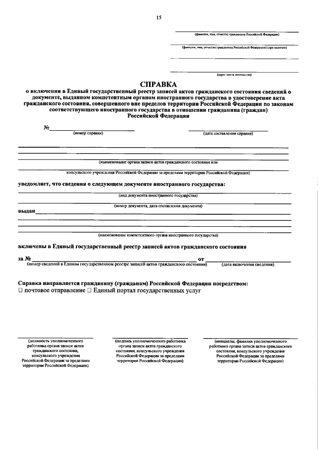 "О ФОРМАХ УВЕДОМЛЕНИЙ О РЕГИСТРАЦИИ КОМПЕТЕНТНЫМ ОРГАНОМ ИНОСТРАННОГО ГОСУДАРСТВА ПО ЗАКОНАМ СООТВЕТСТВУЮЩЕГО ИНОСТРАННОГО ГОСУДАРСТВА В ОТНОШЕНИИ ГРАЖДАНИНА РОССИЙСКОЙ ФЕДЕРАЦИИ ИЛИ В ОТНОШЕНИИ ЕГО НЕСОВЕРШЕННОЛЕТНЕГО РЕБЕНКА, СОСТОЯЩЕГО В ГРАЖДАНСТВЕ РОССИЙСКОЙ ФЕДЕРАЦИИ, ЛИБО В ОТНОШЕНИИ НЕ ДОСТИГШЕГО 18 ЛЕТ ИЛИ ОГРАНИЧЕННОГО В ДЕЕСПОСОБНОСТИ ГРАЖДАНИНА РОССИЙСКОЙ ФЕДЕРАЦИИ, ЗАКОННЫМ ПРЕДСТАВИТЕЛЕМ КОТОРОГО ГРАЖДАНИН РОССИЙСКОЙ ФЕДЕРАЦИИ ЯВЛЯЕТСЯ, АКТА ГРАЖДАНСКОГО СОСТОЯНИЯ, СПРАВКИ О ВКЛЮЧЕНИИ СВЕДЕНИЙ О ДОКУМЕНТЕ, ВЫДАННОМ КОМПЕТЕНТНЫМ ОРГАНОМ ИНОСТРАННОГО ГОСУДАРСТВА В УДОСТОВЕРЕНИЕ АКТА ГРАЖДАНСКОГО СОСТОЯНИЯ, СОВЕРШЕННОГО ВНЕ ПРЕДЕЛОВ ТЕРРИТОРИИ РОССИЙСКОЙ ФЕДЕРАЦИИ ПО ЗАКОНАМ СООТВЕТСТВУЮЩЕГО ИНОСТРАННОГО ГОСУДАРСТВА В ОТНОШЕНИИ ГРАЖДАН РОССИЙСКОЙ ФЕДЕРАЦИИ, И УВЕДОМЛЕНИЯ ОБ ОТКАЗЕ В ИХ ВКЛЮЧЕНИИ В ЕДИНЫЙ ГОСУДАРСТВЕННЫЙ РЕЕСТР ЗАПИСЕЙ АКТОВ ГРАЖДАНСКОГО СОСТОЯНИЯ"