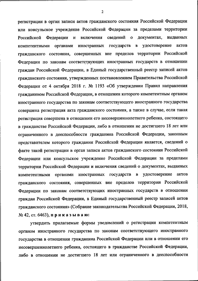 "О ФОРМАХ УВЕДОМЛЕНИЙ О РЕГИСТРАЦИИ КОМПЕТЕНТНЫМ ОРГАНОМ ИНОСТРАННОГО ГОСУДАРСТВА ПО ЗАКОНАМ СООТВЕТСТВУЮЩЕГО ИНОСТРАННОГО ГОСУДАРСТВА В ОТНОШЕНИИ ГРАЖДАНИНА РОССИЙСКОЙ ФЕДЕРАЦИИ ИЛИ В ОТНОШЕНИИ ЕГО НЕСОВЕРШЕННОЛЕТНЕГО РЕБЕНКА, СОСТОЯЩЕГО В ГРАЖДАНСТВЕ РОССИЙСКОЙ ФЕДЕРАЦИИ, ЛИБО В ОТНОШЕНИИ НЕ ДОСТИГШЕГО 18 ЛЕТ ИЛИ ОГРАНИЧЕННОГО В ДЕЕСПОСОБНОСТИ ГРАЖДАНИНА РОССИЙСКОЙ ФЕДЕРАЦИИ, ЗАКОННЫМ ПРЕДСТАВИТЕЛЕМ КОТОРОГО ГРАЖДАНИН РОССИЙСКОЙ ФЕДЕРАЦИИ ЯВЛЯЕТСЯ, АКТА ГРАЖДАНСКОГО СОСТОЯНИЯ, СПРАВКИ О ВКЛЮЧЕНИИ СВЕДЕНИЙ О ДОКУМЕНТЕ, ВЫДАННОМ КОМПЕТЕНТНЫМ ОРГАНОМ ИНОСТРАННОГО ГОСУДАРСТВА В УДОСТОВЕРЕНИЕ АКТА ГРАЖДАНСКОГО СОСТОЯНИЯ, СОВЕРШЕННОГО ВНЕ ПРЕДЕЛОВ ТЕРРИТОРИИ РОССИЙСКОЙ ФЕДЕРАЦИИ ПО ЗАКОНАМ СООТВЕТСТВУЮЩЕГО ИНОСТРАННОГО ГОСУДАРСТВА В ОТНОШЕНИИ ГРАЖДАН РОССИЙСКОЙ ФЕДЕРАЦИИ, И УВЕДОМЛЕНИЯ ОБ ОТКАЗЕ В ИХ ВКЛЮЧЕНИИ В ЕДИНЫЙ ГОСУДАРСТВЕННЫЙ РЕЕСТР ЗАПИСЕЙ АКТОВ ГРАЖДАНСКОГО СОСТОЯНИЯ"