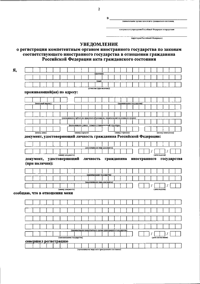 "О ФОРМАХ УВЕДОМЛЕНИЙ О РЕГИСТРАЦИИ КОМПЕТЕНТНЫМ ОРГАНОМ ИНОСТРАННОГО ГОСУДАРСТВА ПО ЗАКОНАМ СООТВЕТСТВУЮЩЕГО ИНОСТРАННОГО ГОСУДАРСТВА В ОТНОШЕНИИ ГРАЖДАНИНА РОССИЙСКОЙ ФЕДЕРАЦИИ ИЛИ В ОТНОШЕНИИ ЕГО НЕСОВЕРШЕННОЛЕТНЕГО РЕБЕНКА, СОСТОЯЩЕГО В ГРАЖДАНСТВЕ РОССИЙСКОЙ ФЕДЕРАЦИИ, ЛИБО В ОТНОШЕНИИ НЕ ДОСТИГШЕГО 18 ЛЕТ ИЛИ ОГРАНИЧЕННОГО В ДЕЕСПОСОБНОСТИ ГРАЖДАНИНА РОССИЙСКОЙ ФЕДЕРАЦИИ, ЗАКОННЫМ ПРЕДСТАВИТЕЛЕМ КОТОРОГО ГРАЖДАНИН РОССИЙСКОЙ ФЕДЕРАЦИИ ЯВЛЯЕТСЯ, АКТА ГРАЖДАНСКОГО СОСТОЯНИЯ, СПРАВКИ О ВКЛЮЧЕНИИ СВЕДЕНИЙ О ДОКУМЕНТЕ, ВЫДАННОМ КОМПЕТЕНТНЫМ ОРГАНОМ ИНОСТРАННОГО ГОСУДАРСТВА В УДОСТОВЕРЕНИЕ АКТА ГРАЖДАНСКОГО СОСТОЯНИЯ, СОВЕРШЕННОГО ВНЕ ПРЕДЕЛОВ ТЕРРИТОРИИ РОССИЙСКОЙ ФЕДЕРАЦИИ ПО ЗАКОНАМ СООТВЕТСТВУЮЩЕГО ИНОСТРАННОГО ГОСУДАРСТВА В ОТНОШЕНИИ ГРАЖДАН РОССИЙСКОЙ ФЕДЕРАЦИИ, И УВЕДОМЛЕНИЯ ОБ ОТКАЗЕ В ИХ ВКЛЮЧЕНИИ В ЕДИНЫЙ ГОСУДАРСТВЕННЫЙ РЕЕСТР ЗАПИСЕЙ АКТОВ ГРАЖДАНСКОГО СОСТОЯНИЯ"