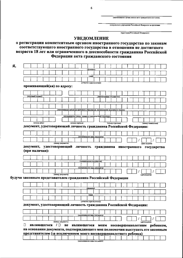 "О ФОРМАХ УВЕДОМЛЕНИЙ О РЕГИСТРАЦИИ КОМПЕТЕНТНЫМ ОРГАНОМ ИНОСТРАННОГО ГОСУДАРСТВА ПО ЗАКОНАМ СООТВЕТСТВУЮЩЕГО ИНОСТРАННОГО ГОСУДАРСТВА В ОТНОШЕНИИ ГРАЖДАНИНА РОССИЙСКОЙ ФЕДЕРАЦИИ ИЛИ В ОТНОШЕНИИ ЕГО НЕСОВЕРШЕННОЛЕТНЕГО РЕБЕНКА, СОСТОЯЩЕГО В ГРАЖДАНСТВЕ РОССИЙСКОЙ ФЕДЕРАЦИИ, ЛИБО В ОТНОШЕНИИ НЕ ДОСТИГШЕГО 18 ЛЕТ ИЛИ ОГРАНИЧЕННОГО В ДЕЕСПОСОБНОСТИ ГРАЖДАНИНА РОССИЙСКОЙ ФЕДЕРАЦИИ, ЗАКОННЫМ ПРЕДСТАВИТЕЛЕМ КОТОРОГО ГРАЖДАНИН РОССИЙСКОЙ ФЕДЕРАЦИИ ЯВЛЯЕТСЯ, АКТА ГРАЖДАНСКОГО СОСТОЯНИЯ, СПРАВКИ О ВКЛЮЧЕНИИ СВЕДЕНИЙ О ДОКУМЕНТЕ, ВЫДАННОМ КОМПЕТЕНТНЫМ ОРГАНОМ ИНОСТРАННОГО ГОСУДАРСТВА В УДОСТОВЕРЕНИЕ АКТА ГРАЖДАНСКОГО СОСТОЯНИЯ, СОВЕРШЕННОГО ВНЕ ПРЕДЕЛОВ ТЕРРИТОРИИ РОССИЙСКОЙ ФЕДЕРАЦИИ ПО ЗАКОНАМ СООТВЕТСТВУЮЩЕГО ИНОСТРАННОГО ГОСУДАРСТВА В ОТНОШЕНИИ ГРАЖДАН РОССИЙСКОЙ ФЕДЕРАЦИИ, И УВЕДОМЛЕНИЯ ОБ ОТКАЗЕ В ИХ ВКЛЮЧЕНИИ В ЕДИНЫЙ ГОСУДАРСТВЕННЫЙ РЕЕСТР ЗАПИСЕЙ АКТОВ ГРАЖДАНСКОГО СОСТОЯНИЯ"