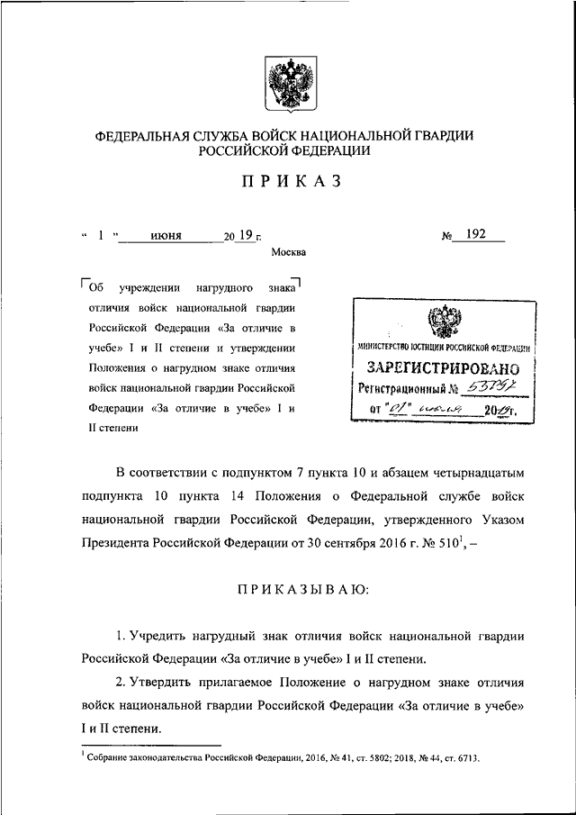ПРИКАЗ Росгвардии от 01.06.2019 N 192