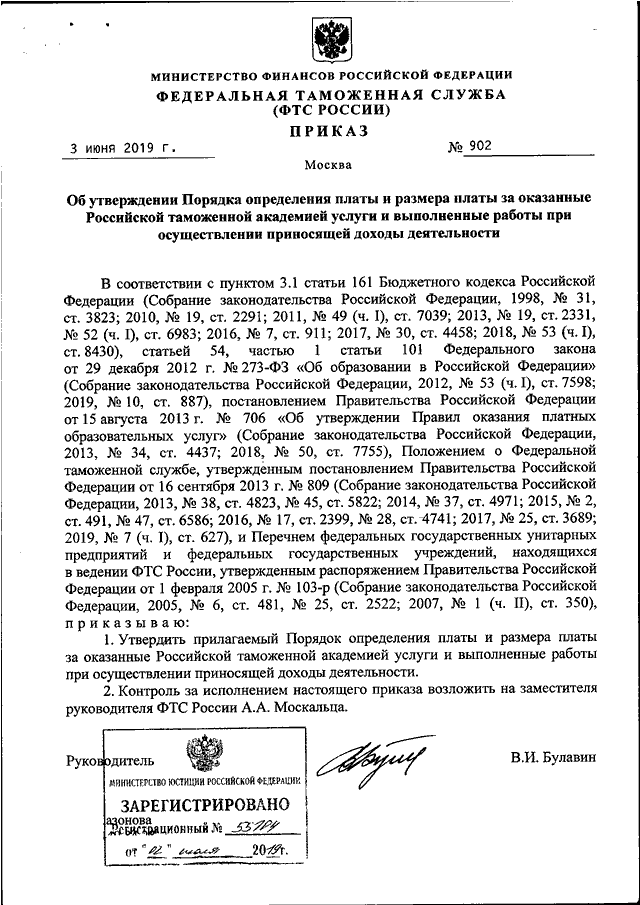ПРИКАЗ ФТС РФ от 03.06.2019 N 902