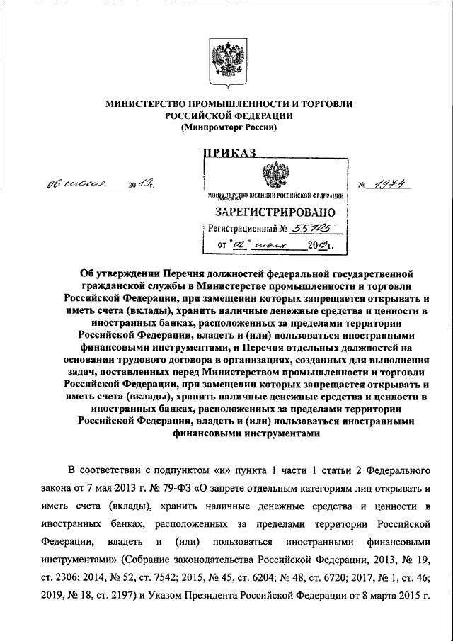 "ОБ УТВЕРЖДЕНИИ ПЕРЕЧНЯ ДОЛЖНОСТЕЙ ФЕДЕРАЛЬНОЙ ГОСУДАРСТВЕННОЙ ГРАЖДАНСКОЙ СЛУЖБЫ В МИНИСТЕРСТВЕ ПРОМЫШЛЕННОСТИ И ТОРГОВЛИ РОССИЙСКОЙ ФЕДЕРАЦИИ, ПРИ ЗАМЕЩЕНИИ КОТОРЫХ ЗАПРЕЩАЕТСЯ ОТКРЫВАТЬ И ИМЕТЬ СЧЕТА (ВКЛАДЫ), ХРАНИТЬ НАЛИЧНЫЕ ДЕНЕЖНЫЕ СРЕДСТВА И ЦЕННОСТИ В ИНОСТРАННЫХ БАНКАХ, РАСПОЛОЖЕННЫХ ЗА ПРЕДЕЛАМИ ТЕРРИТОРИИ РОССИЙСКОЙ ФЕДЕРАЦИИ, ВЛАДЕТЬ И (ИЛИ) ПОЛЬЗОВАТЬСЯ ИНОСТРАННЫМИ ФИНАНСОВЫМИ ИНСТРУМЕНТАМИ, И ПЕРЕЧНЯ ОТДЕЛЬНЫХ ДОЛЖНОСТЕЙ НА ОСНОВАНИИ ТРУДОВОГО ДОГОВОРА В ОРГАНИЗАЦИЯХ, СОЗДАННЫХ ДЛЯ ВЫПОЛНЕНИЯ ЗАДАЧ, ПОСТАВЛЕННЫХ ПЕРЕД МИНИСТЕРСТВОМ ПРОМЫШЛЕННОСТИ И ТОРГОВЛИ РОССИЙСКОЙ ФЕДЕРАЦИИ, ПРИ ЗАМЕЩЕНИИ КОТОРЫХ ЗАПРЕЩАЕТСЯ ОТКРЫВАТЬ И ИМЕТЬ СЧЕТА (ВКЛАДЫ), ХРАНИТЬ НАЛИЧНЫЕ ДЕНЕЖНЫЕ СРЕДСТВА И ЦЕННОСТИ В ИНОСТРАННЫХ БАНКАХ, РАСПОЛОЖЕННЫХ ЗА ПРЕДЕЛАМИ ТЕРРИТОРИИ РОССИЙСКОЙ ФЕДЕРАЦИИ, ВЛАДЕТЬ И (ИЛИ) ПОЛЬЗОВАТЬСЯ ИНОСТРАННЫМИ ФИНАНСОВЫМИ ИНСТРУМЕНТАМИ"