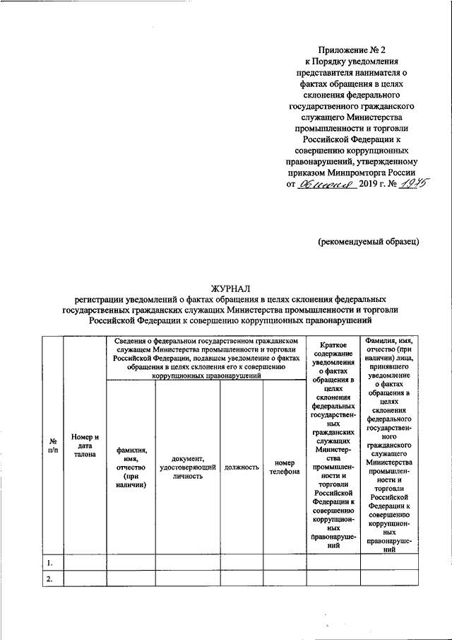 "ОБ УТВЕРЖДЕНИИ ПОРЯДКА УВЕДОМЛЕНИЯ ПРЕДСТАВИТЕЛЯ НАНИМАТЕЛЯ (РАБОТОДАТЕЛЯ) О ФАКТАХ ОБРАЩЕНИЯ В ЦЕЛЯХ СКЛОНЕНИЯ ФЕДЕРАЛЬНОГО ГОСУДАРСТВЕННОГО ГРАЖДАНСКОГО СЛУЖАЩЕГО МИНИСТЕРСТВА ПРОМЫШЛЕННОСТИ И ТОРГОВЛИ РОССИЙСКОЙ ФЕДЕРАЦИИ К СОВЕРШЕНИЮ КОРРУПЦИОННЫХ ПРАВОНАРУШЕНИЙ"