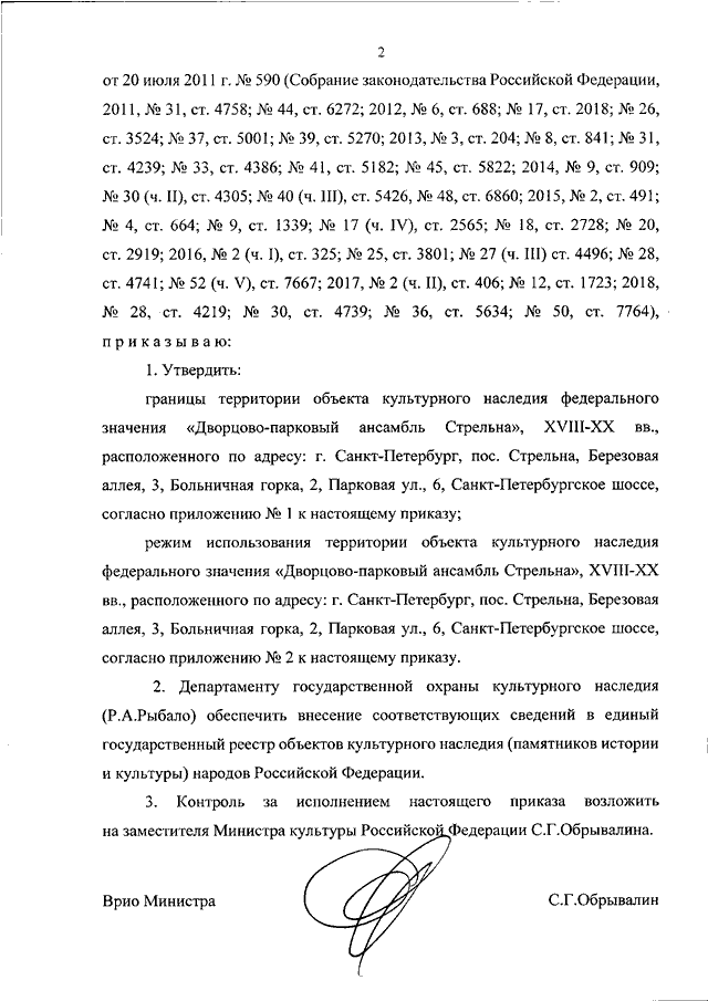 "ОБ УТВЕРЖДЕНИИ ГРАНИЦ И РЕЖИМА ИСПОЛЬЗОВАНИЯ ТЕРРИТОРИИ ОБЪЕКТА КУЛЬТУРНОГО НАСЛЕДИЯ ФЕДЕРАЛЬНОГО ЗНАЧЕНИЯ "ДВОРЦОВО - ПАРКОВЫЙ АНСАМБЛЬ СТРЕЛЬНА", XVIII - XX ВВ., РАСПОЛОЖЕННОГО ПО АДРЕСУ: Г. САНКТ-ПЕТЕРБУРГ, ПОС. СТРЕЛЬНА, БЕРЕЗОВАЯ АЛЛЕЯ, 3, БОЛЬНИЧНАЯ ГОРКА, 2, ПАРКОВАЯ УЛ., 6, САНКТ-ПЕТЕРБУРГСКОЕ ШОССЕ"