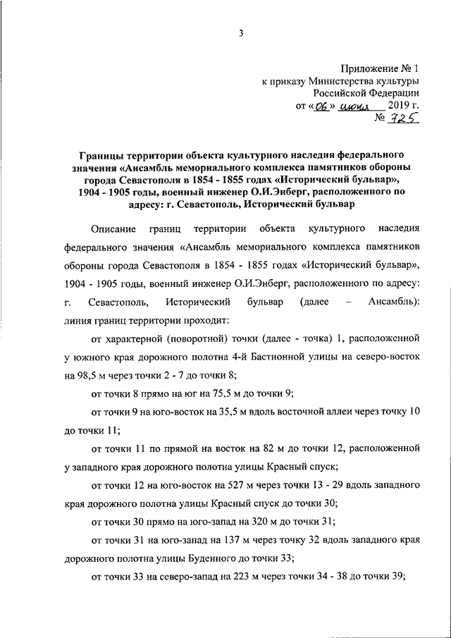 "ОБ УТВЕРЖДЕНИИ ГРАНИЦ И РЕЖИМА ИСПОЛЬЗОВАНИЯ ТЕРРИТОРИИ ОБЪЕКТА КУЛЬТУРНОГО НАСЛЕДИЯ ФЕДЕРАЛЬНОГО ЗНАЧЕНИЯ "АНСАМБЛЬ МЕМОРИАЛЬНОГО КОМПЛЕКСА ПАМЯТНИКОВ ОБОРОНЫ ГОРОДА СЕВАСТОПОЛЯ В 1854 - 1855 ГОДАХ "ИСТОРИЧЕСКИЙ БУЛЬВАР", 1904 - 1905 ГОДЫ, ВОЕННЫЙ ИНЖЕНЕР О.И. ЭНБЕРГ, РАСПОЛОЖЕННОГО ПО АДРЕСУ: Г. СЕВАСТОПОЛЬ, ИСТОРИЧЕСКИЙ БУЛЬВАР"