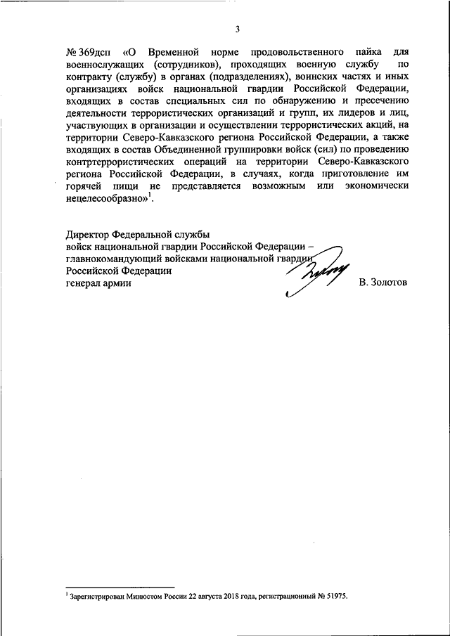 "ОБ УТВЕРЖДЕНИИ ВРЕМЕННЫХ НОРМ ПРОДОВОЛЬСТВЕННЫХ ПАЙКОВ ДЛЯ ВОЕННОСЛУЖАЩИХ ВОЙСК НАЦИОНАЛЬНОЙ ГВАРДИИ РОССИЙСКОЙ ФЕДЕРАЦИИ И НЕКОТОРЫХ ДРУГИХ КАТЕГОРИЙ ЛИЦ, ВЫПОЛНЯЮЩИХ СПЕЦИАЛЬНЫЕ И ДРУГИЕ ЗАДАЧИ, И ПРИЗНАНИИ УТРАТИВШИМ СИЛУ ПРИКАЗА ФЕДЕРАЛЬНОЙ СЛУЖБЫ ВОЙСК НАЦИОНАЛЬНОЙ ГВАРДИИ РОССИЙСКОЙ ФЕДЕРАЦИИ ОТ 8 АВГУСТА 2018 Г. N 369ДСП"