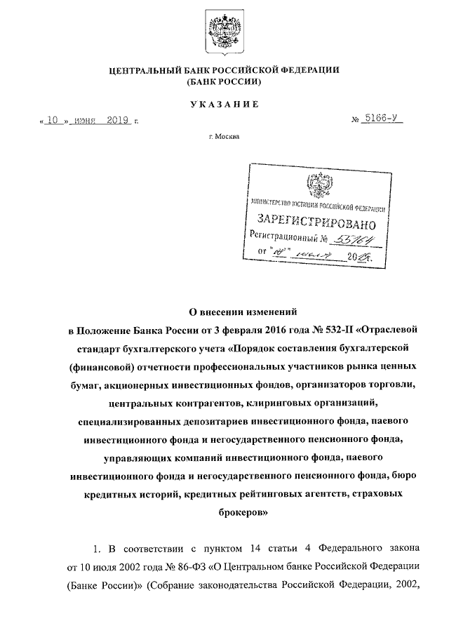 "О ВНЕСЕНИИ ИЗМЕНЕНИЙ В ПОЛОЖЕНИЕ БАНКА РОССИИ ОТ 3 ФЕВРАЛЯ 2016 Г. N 532-П "ОТРАСЛЕВОЙ СТАНДАРТ БУХГАЛТЕРСКОГО УЧЕТА "ПОРЯДОК СОСТАВЛЕНИЯ БУХГАЛТЕРСКОЙ (ФИНАНСОВОЙ) ОТЧЕТНОСТИ ПРОФЕССИОНАЛЬНЫХ УЧАСТНИКОВ РЫНКА ЦЕННЫХ БУМАГ, АКЦИОНЕРНЫХ ИНВЕСТИЦИОННЫХ ФОНДОВ, ОРГАНИЗАТОРОВ ТОРГОВЛИ, ЦЕНТРАЛЬНЫХ КОНТРАГЕНТОВ, КЛИРИНГОВЫХ ОРГАНИЗАЦИЙ, СПЕЦИАЛИЗИРОВАННЫХ ДЕПОЗИТАРИЕВ ИНВЕСТИЦИОННОГО ФОНДА, ПАЕВОГО ИНВЕСТИЦИОННОГО ФОНДА И НЕГОСУДАРСТВЕННОГО ПЕНСИОННОГО ФОНДА, УПРАВЛЯЮЩИХ КОМПАНИЙ ИНВЕСТИЦИОННОГО ФОНДА, ПАЕВОГО ИНВЕСТИЦИОННОГО ФОНДА И НЕГОСУДАРСТВЕННОГО ПЕНСИОННОГО ФОНДА, БЮРО КРЕДИТНЫХ ИСТОРИЙ, КРЕДИТНЫХ РЕЙТИНГОВЫХ АГЕНТСТВ, СТРАХОВЫХ БРОКЕРОВ"