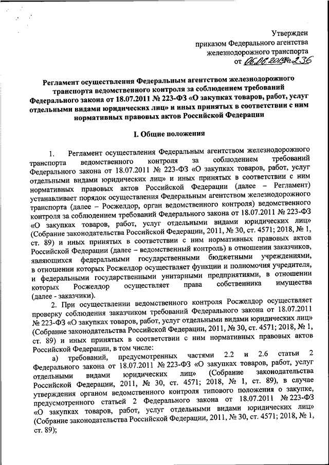 "ОБ УТВЕРЖДЕНИИ РЕГЛАМЕНТА ОСУЩЕСТВЛЕНИЯ ФЕДЕРАЛЬНЫМ АГЕНТСТВОМ ЖЕЛЕЗНОДОРОЖНОГО ТРАНСПОРТА ВЕДОМСТВЕННОГО КОНТРОЛЯ ЗА СОБЛЮДЕНИЕМ ТРЕБОВАНИЙ ФЕДЕРАЛЬНОГО ЗАКОНА ОТ 18.07.2011 N 223-ФЗ "О ЗАКУПКАХ ТОВАРОВ, РАБОТ, УСЛУГ ОТДЕЛЬНЫМИ ВИДАМИ ЮРИДИЧЕСКИХ ЛИЦ" И ИНЫХ ПРИНЯТЫХ В СООТВЕТСТВИИ С НИМ НОРМАТИВНЫХ ПРАВОВЫХ АКТОВ РОССИЙСКОЙ ФЕДЕРАЦИИ"