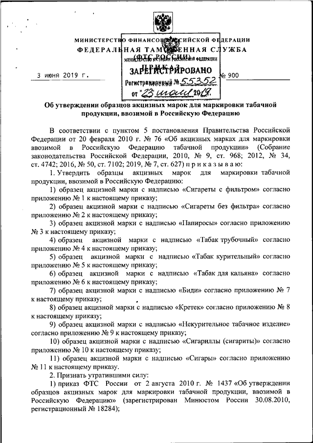 ПРИКАЗ ФТС РФ от 03.06.2019 N 900